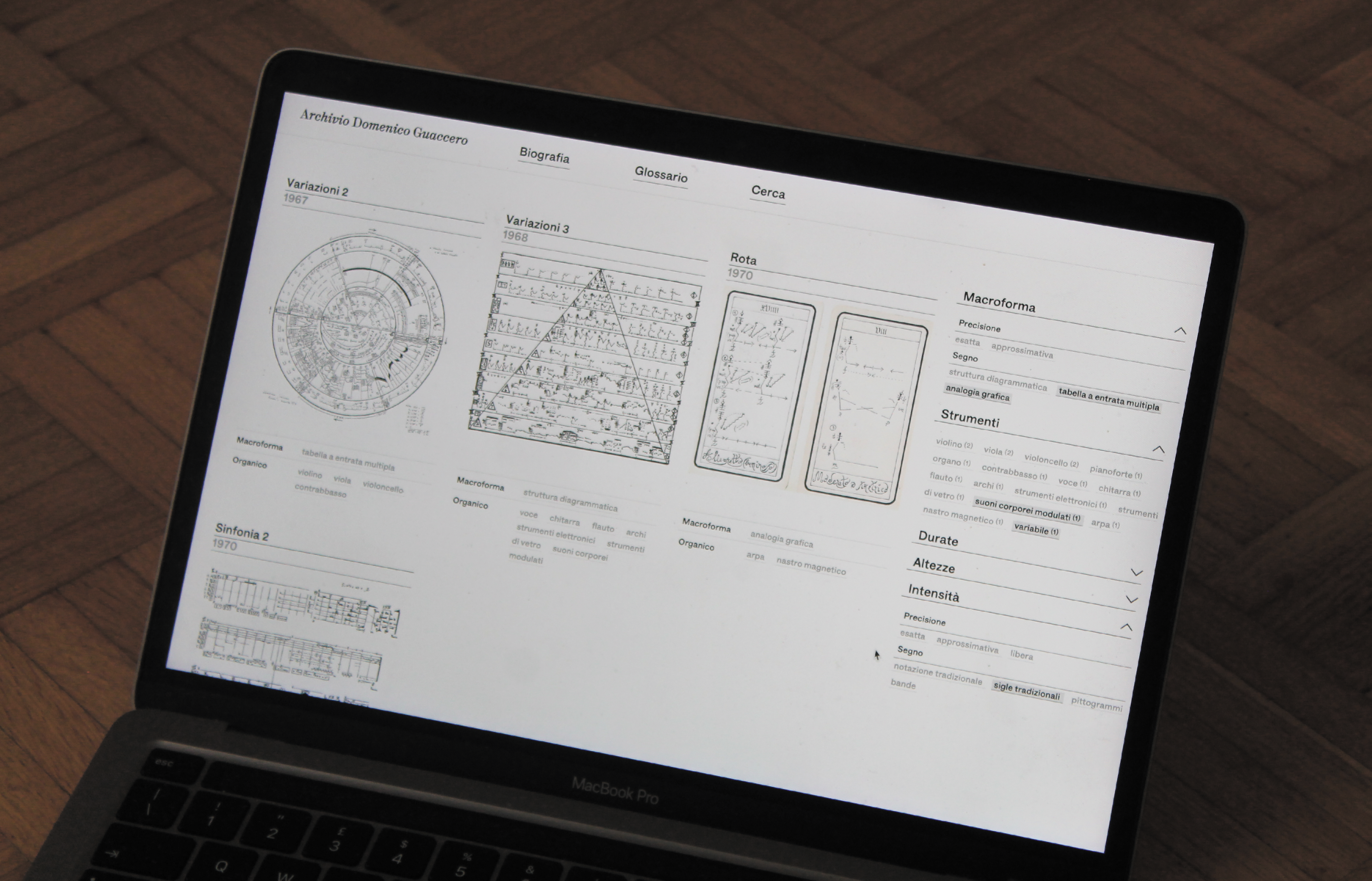 The project aims to map the de characteristics of twentieth-century music graphic scores so as to design a digital archive to accommodate them. To do this, the work of Domenico Guaccero, an Apulian musician active between the 1960s and 1980s, was taken as a sample. After a theoretical analysis based mainly on the framework developed by Andrea Valle in his La notazione musicale contemporanea (2002), the data acquired from these scores were put into logical form. For the production of the prototype, the state of the art of archives in the cultural field, and specifically music, was analyzed, thus designing an architecture in line with the Italian REICAT cataloging rules, combined with the graphic score analysis categories developed by Kurt Stone in 1980. The result is an archive model that is heterarchical and scalable to graphic scores in general, a working and implementable prototype of which is presented with this thesis.
